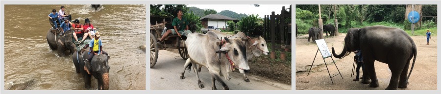 【湄登叢林之旅三合一】給各位貴賓來一趟叢林之旅,首先來到【大象學校】於此參觀工作人員在訓練大小象的工作的情形並觀看他們所安排的精彩大象表演,大象現場作畫表演,欣賞可愛大象自由隨性揮瀷表演獨創的繪畫天份。隨後將您親身體驗騎大象絕妙的情趣,穿越叢林,體會古代皇帝用以代步座騎大象,品味越野情趣,此乃是人生一項難得又絕妙的回憶。接著坐牛車,牛車是昔日鄉下農家的交通工具,隨著時代的進步已早被淘汰和遺忘,但在這裡您可看到或親自享受時光倒流,體驗一下鄉間的 “牛車之旅”,您會感到格外的新奇有趣。【五族部落少數民族村:長頸族、大耳族、阿卡族、黎蘇族、拉胡族】、其中最特殊的一族為長頸族,您可見到長頸族的風俗習慣與生活情形。此族群的族人已日益稀少,故更顯現出它們的特別,由於長頸族人古老傳統習性,小女孩七歲開始就須在脖子上套銅圈,且隨著年紀的成長銅圈越加越高,直到結婚為止。