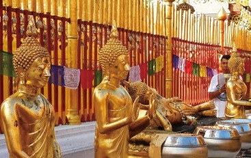 【雙龍寺】坐落於素貼山上,由蘭娜王朝第六代國王建於公元1383年,當時得到了一顆佛主舍利子,為尋找供奉地點,便將舍利子放在白象的背上,任由其尋找供奉捨地點,白象登上素貼山,走到現址趴下,就此建塔供奉舍利子,台階兩旁一雙七頭巨龍坐臥,昂首挺胸,目視前方,富有藝術價值,站在的瞭望台上還可以俯瞰清邁市的全景。註1:雙龍寺-每逢週末及泰國假日,上山設有交通管制了,遊覽車不能上,團體必須改坐雙排車上山。註2:如果到當地發現儀容不符規定,售票處提供沙龍租借,一次約20銖,將沙龍圍在腰間,遮住下半身即可。【蘭納古城之旅】遊客坐上遊覽車可以在古城內遊覽,三王銅像古城寺廟以及商業店鋪和古城護城河以及遺址原貌,融入當地人的生活,體驗清邁蘭娜文化的集市。【清邁夜市】清邁夜市位於清邁最熱鬧的昌康路( Chang Klan Road )是泰國旅遊清邁行程必去的景點,在這裡能買到價格優惠的手工藝品,富有少數民族與泰式傳統風情的服裝飾品,如十字繡的衣物、手工編織的包包、染上五顏六色的泰絲,都是清邁夜市必買的物品。
