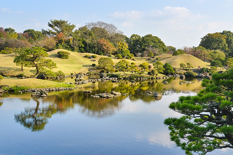 水前寺】是一個以天然噴泉池為中心建造的傳統日式庭園。本區域原為由熊本藩主細川忠利建於 1632 年的水前寺所在地。之後,其孫子細川綱利則圍繞著水前寺,建造了我們現在看到的庭園。池塘、樹木與山丘的相對配置,原是再現了「東海道五十三次」的其中一部分,並包含了一個小型的富士山造景,其中東海道指在江戶與京都之間的著名道路。