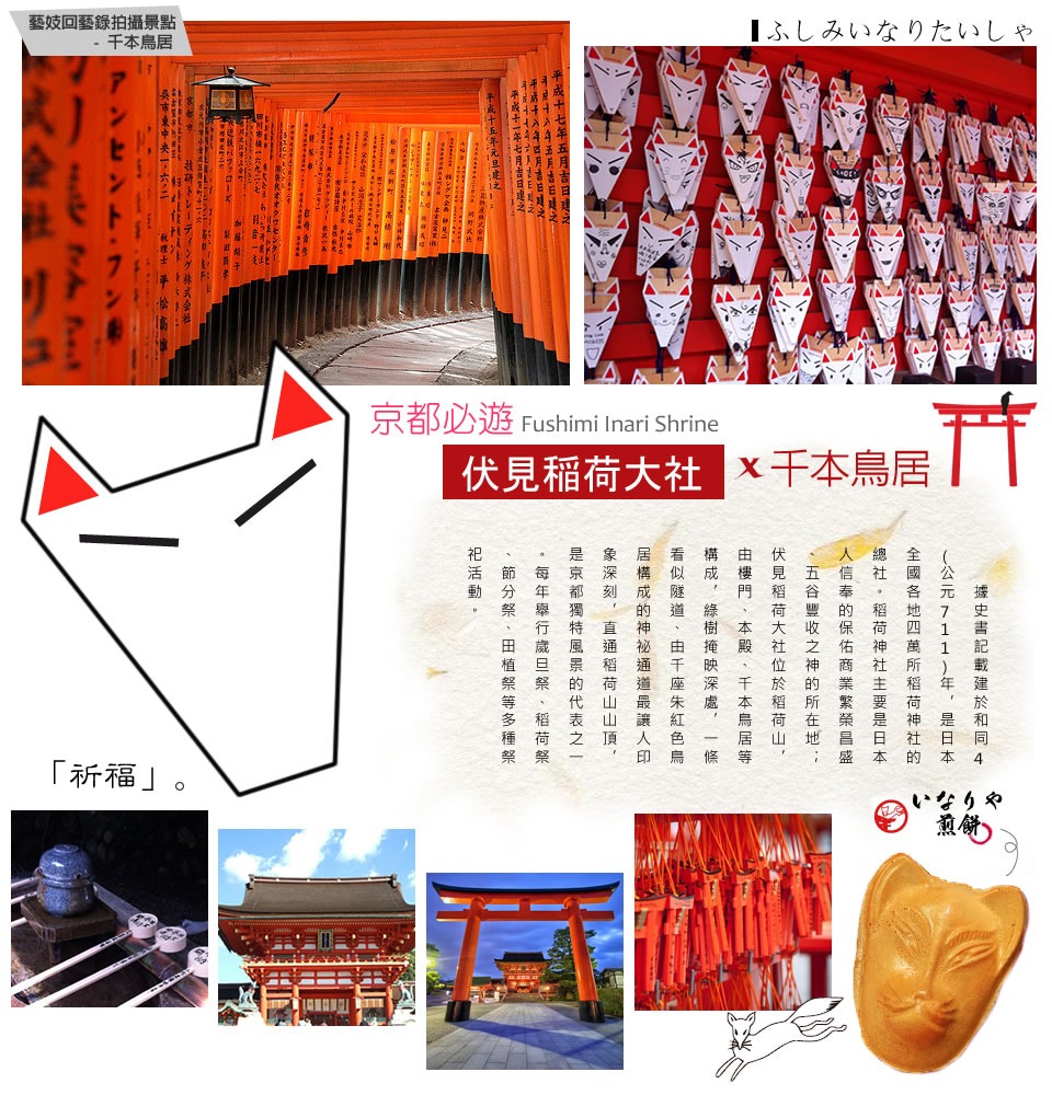 伏見稻荷大社】是一座位於日本京都市伏見區內的神社,是遍及日本全國各地約三萬所的稻荷神社之總本社,也是近畿地方初詣參拜者最多的社寺(2010年日本國內第4位)。以境內所擁有的「千本鳥居」聞名。