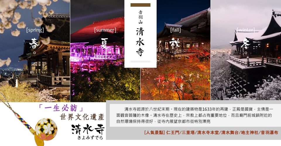 【清水寺】 (入內參觀)以清水舞台及求姻緣著名,所有建築物都要求與自然協調,為棟樑結構式寺院,各式風雅殿堂美輪美奐。寺院建築氣勢宏偉,結構巧妙,未用一根釘子。寺中六層炬木築成的木台為日本所罕見。其中由139根高數十公尺長的大圓木支撐、建築於峭壁上伸展而出的清水舞台更聞名於全日本,由此俯視京都全景更是絕美無比。站在院內眺望從樹林中升起的清水舞台、或站在清水舞台下方、或從茂密的枝葉中仰望斷崖上的清水舞台,各個角度都讓人嘆為觀止。據說舉凡從舞台及姻緣石走過一遭者,除可健康長壽外更可締結良緣。